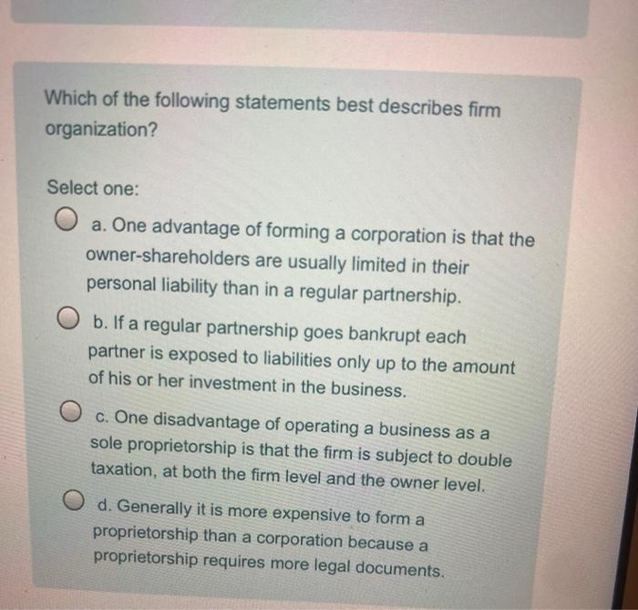 A Partnership firm has a more structured format than a Sole Proprietorship as the terms and conditions of a Partnership firm are pre-defined by way of a Partn. To take advantage of little government oversight. Because you are the sole owner of the business you have complete control over all decisions. Which best explains why a sole proprietor would want a partner. In a Sole Proprietorship the owner is entitled to all profits of the business but is also personally liable for all obligations. Very often a small business owner will choose to start with a proprietorship. The owner of a sole proprietorship has full control over all decisions in the business and does not have to answer to a partner or board.