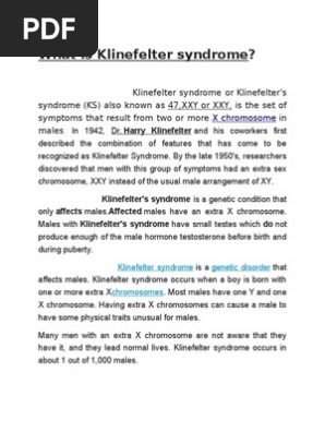 Humans have 46 chromosomes which contain all of a persons genes and DNA. Klinefelter syndrome KS is a condition that occurs in males when they have an extra X chromosome. Klinefelter syndrome is named for Harry Klinefelter an American physician who in 1942 described a set of symptoms that characterized the condition.