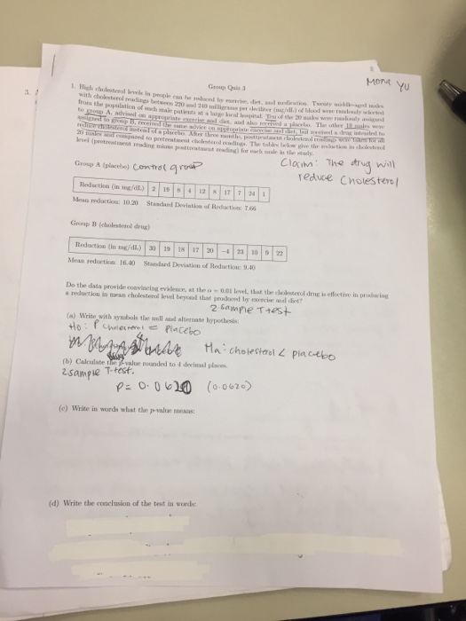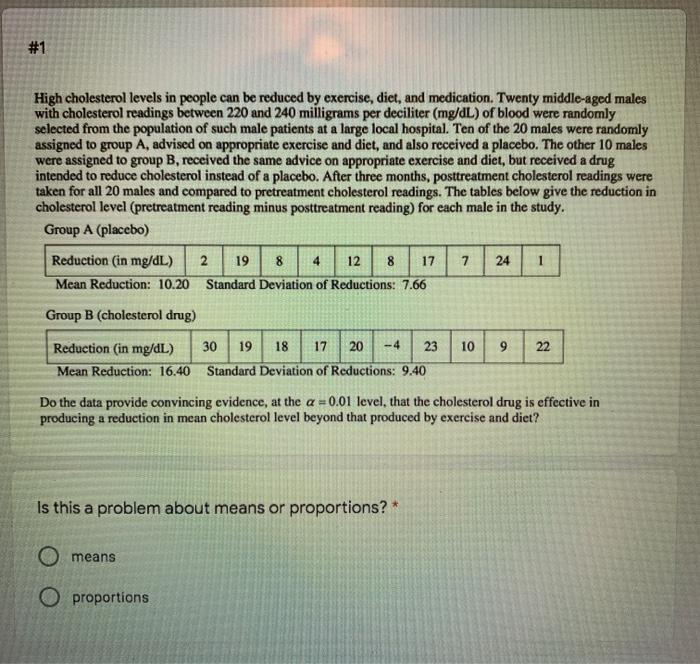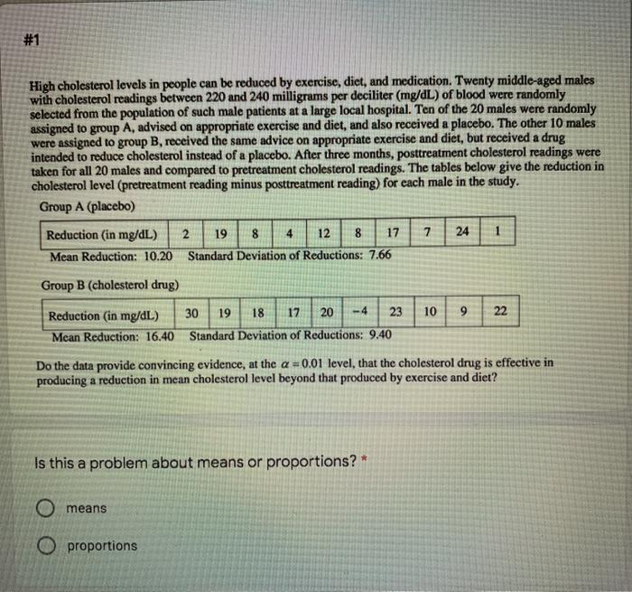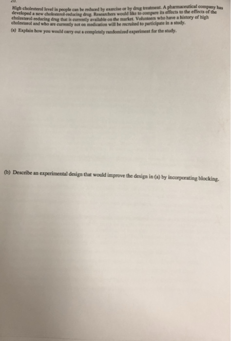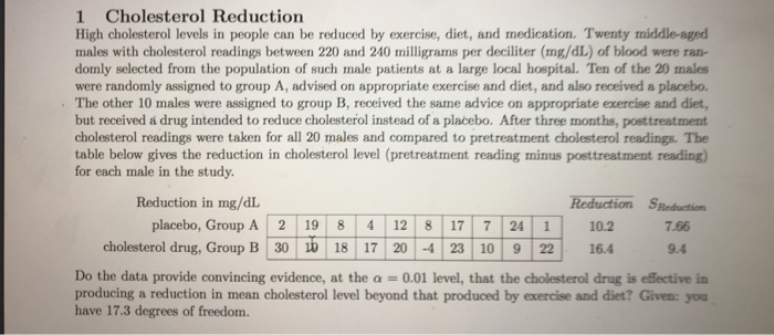 High cholesterol level in people can be reduced by exercise or by drug treatment. Often high cholesterol can be lowered by exercise and a healthy diet. High cholesterol level in people can be reduced by exercise or by drug from MATH 1635 at College of DuPage. A pharmaceutical company has developed a new cholesterol-reducing drug.